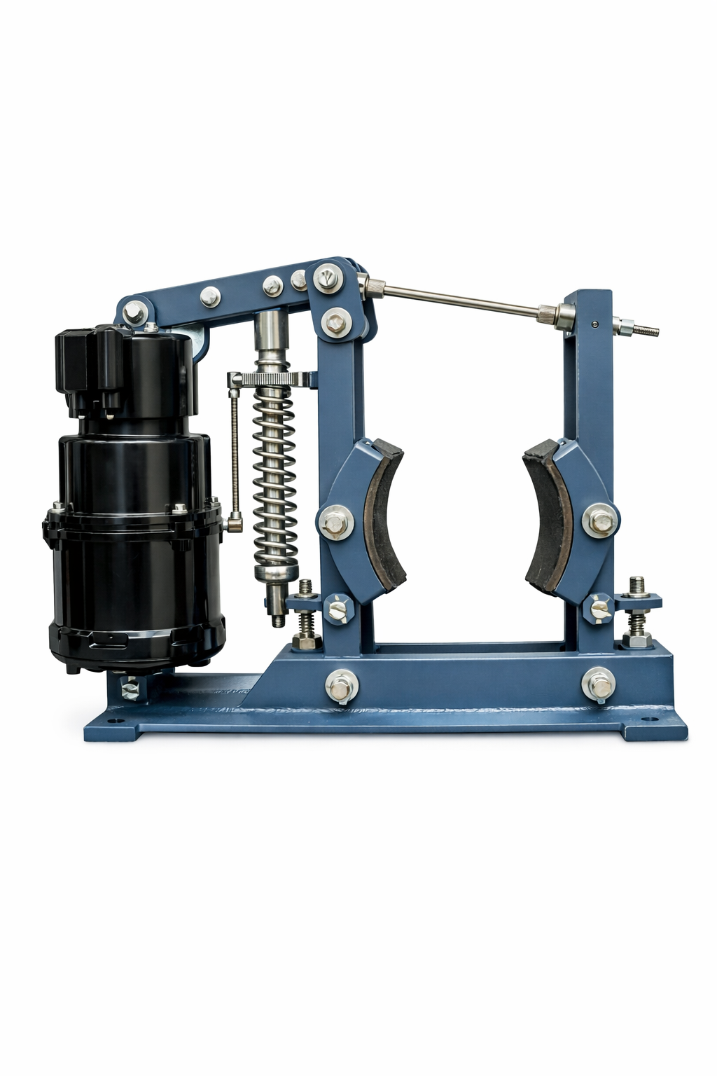 A thruster brake slows and precisely stops moving machinery by applying force to brake shoes using a pre-stressed spring system.